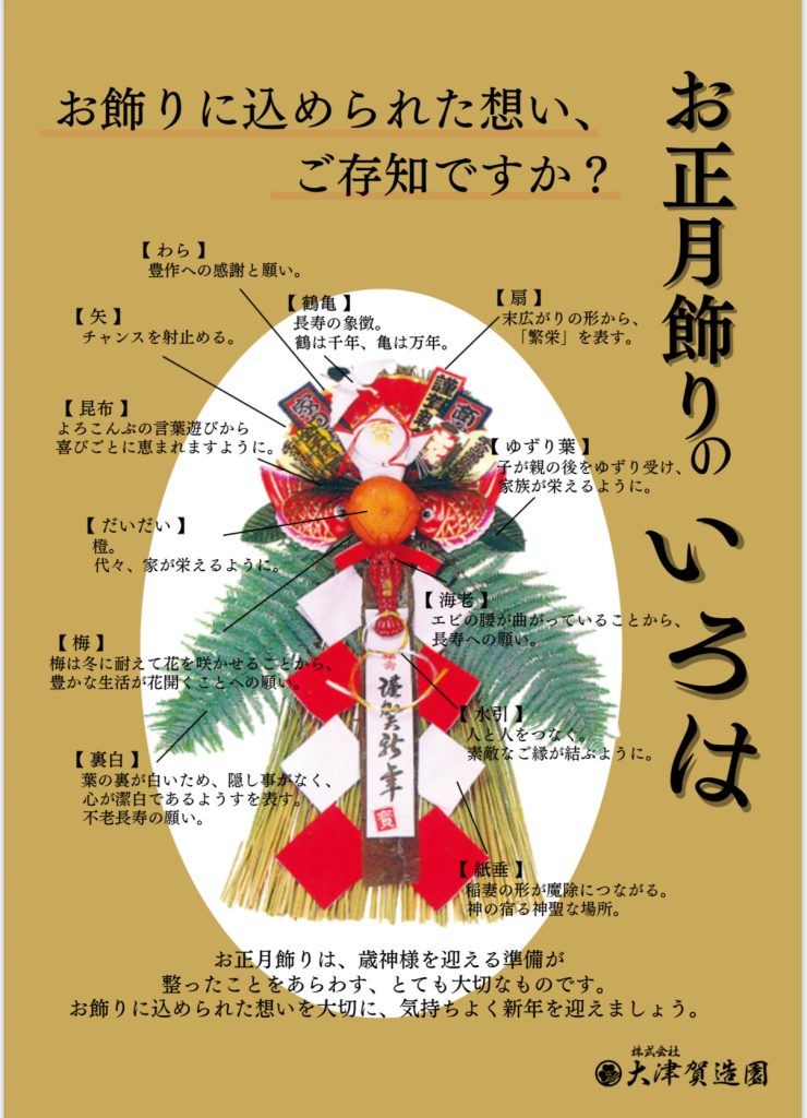 稲わらで編んだしめ縄は豊作祈願、葉の裏が白いウラジロは年神様に清い心を持っていることを表し、新芽が出てから古い葉っぱが落ちるユズリハは子孫繁栄を表します。